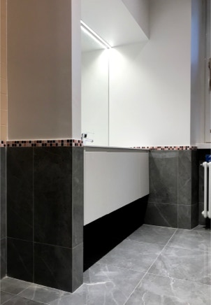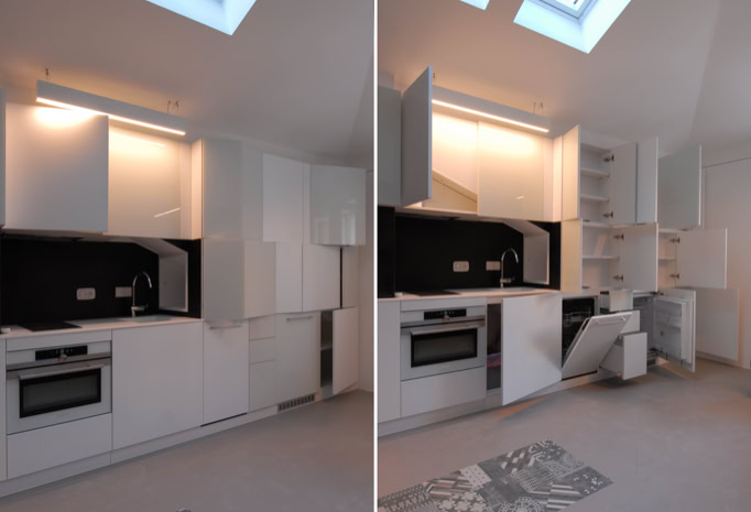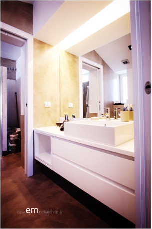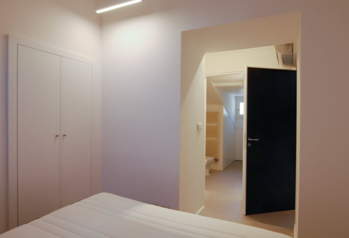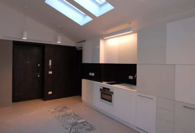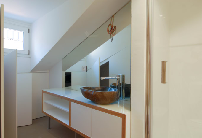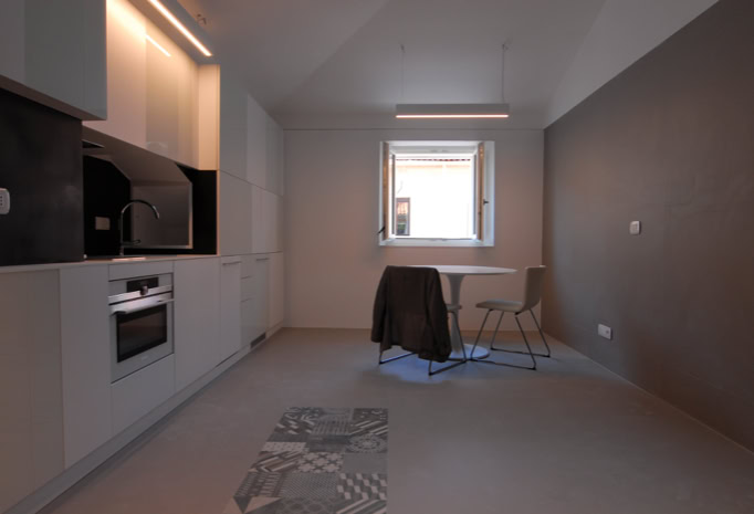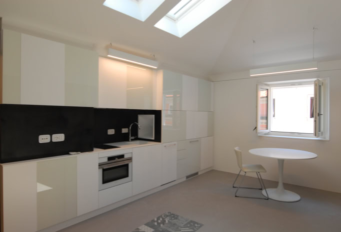 Nel centro storico di Trieste, una soffitta abbandonata di meno di 40mq che ci è stato richiesto di recuperare per un investimento tarato sulla rivendibilità trasformando lo spazio in un alloggio di qualità. Abbiamo progettato il recupero di questa soffitta nel dettaglio utilizzando - con il disegno e la costruzione su misura degli arredi - ogni centimetro a disposizione. Il progetto si basa sulla ricerca della qualità del materiale da rivestimento e sul contrasto tra opacità e lucentezza delle superfici e in generale sulla pulizia del disegno, vera ossatura del progetto.