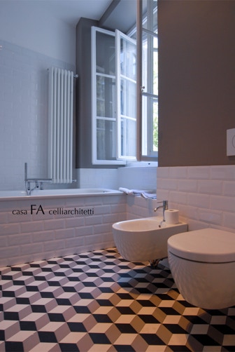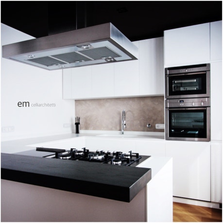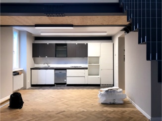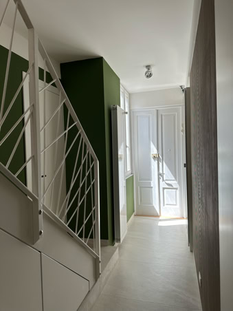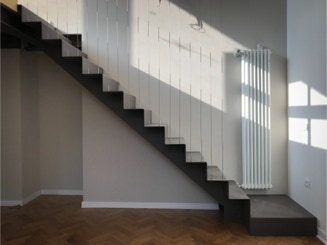 In una casa del primo 900 di cui abbiamo trattato il restauro delle facciate, siamo stati incaricati del recupero di 2 alloggi speculari di circa 70 mq ciascuno con richiesta di ampliarne la superficie. Unificandoli con le soprastanti soffitte ne abbiamo tratto ambienti openspace a doppia altezza con terrazze a vasca. Per staccare gli ambienti sono stati usati i materiali: il pavimento in rovere restaurato e integrato per la zona giorno, le cementine esagonali stile novecento per la cucina. La scala in lamiera di ferro color tabacco porta al soppalco la cui struttura è a vista.