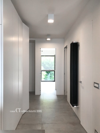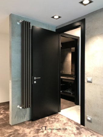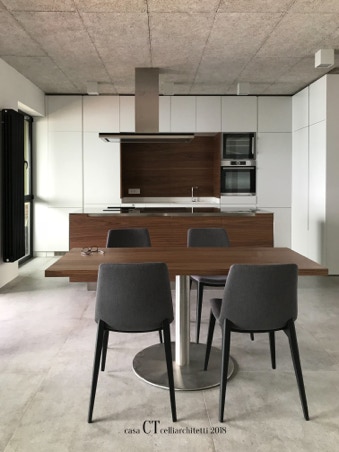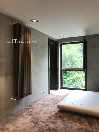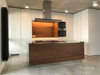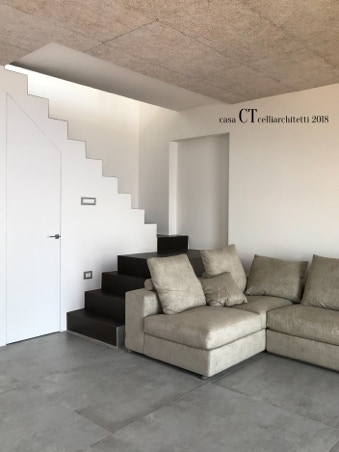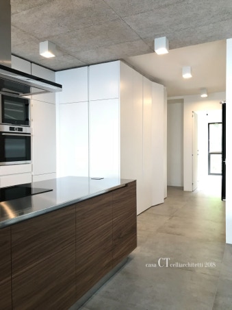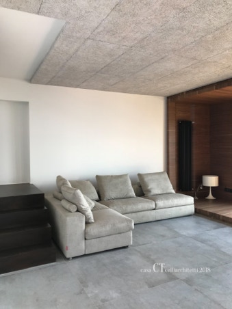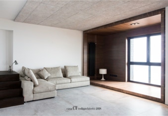 Alla fine del 2017 ci è stato commissionato questo progetto per la ristrutturazione di un grande e anonimo appartamento su due livelli con una vista incomparabile sul golfo di Trieste. Il living caratterizzato da una “volume multiuso” ispirato da un progetto degli anni 70 di F. Gehry mescola l’utilizzo di materie prime come il cemento grezzo per i pavimenti e pannelli fonoassorbenti per i soffitti ad elementi più rifiniti ed accoglienti in legno di noce per le pareti tutti disegnati e costruiti su misura. I pavimenti in moquette della zona notte e la laccatura nera delle porte regalano inoltre un look vintage e raffinato ad una casa volutamente “dura”.