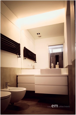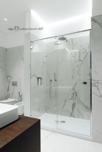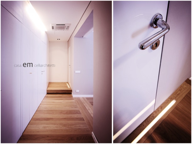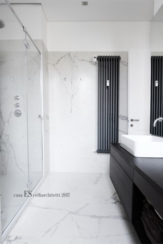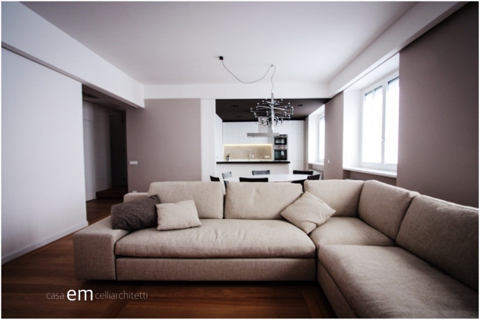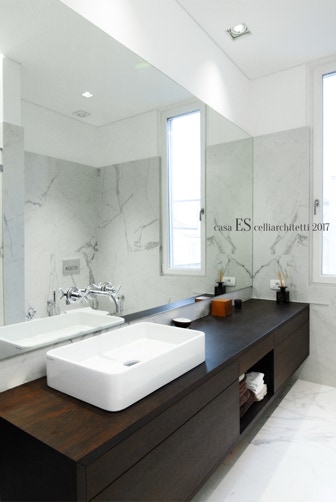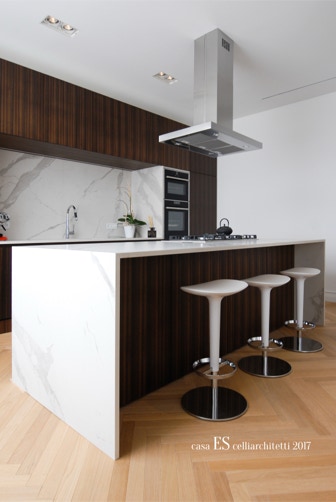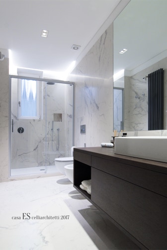 Nella primavera 2017 abbiamo lavorato a questo progetto per il restyling di un grande appartamento dei tardi anni 30. Molto semplice la re-distribuzione degli spazi. I circa 150 mq interni sono tagliati da un grande atrio che separa la zona giorno dalla zona notte. Cucina, area pranzo e soggiorno sono parte di un unico grande ambiente con arredi realizzati su disegno e caratterizzato da enormi superfici vetrate. Il marmo di Carrara usato nei bagni e per gli sfondati della cucina è stato bilanciato dal calore del legno di eucalipto utilizzato per gli arredi fissi. L’attenzione ai dettagli, dal disegno del battiscopa alla dimensione e posa dei listelli del pavimento, dalla scelta dell’essenza del legno negli arredi, al marmo, richiamano il carattere anni 40 dell’edificio.
