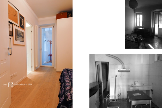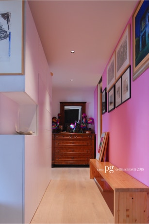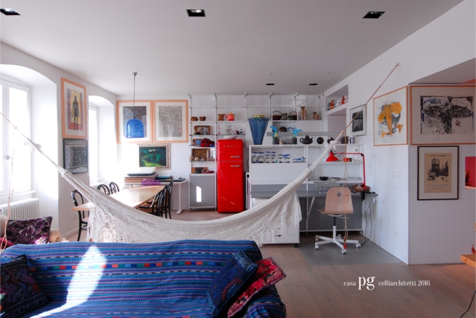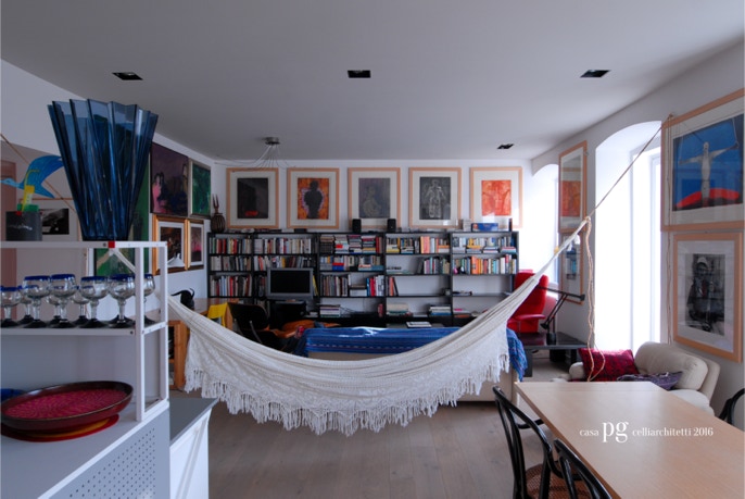 Abbiamo conosciuto PG in uno dei suoi viaggi di rientro da Caracas. Goriziano di nascita, dagli anni 50 in Venezuela, considerato oggi tra i più importanti fotografi delle Americhe, ci ha commissionato questo progetto nel 2015. In un alloggio ottocentesco fronte mare sulle Rive di Trieste, con grosse problematiche strutturali e tipologia distributiva inservibile, ci è stato richiesto di riprogettare gli spazi realizzando una casa atelier dove vivere e lavorare tenuto conto di una ampia collezione di quadri e ricordi. La zona giorno è diventata un open space arricchito da colori vivaci (rosa messicano) dove alloggiare le amate amache e un numero indefinito di quadri, oggetti da collezione, libri d’arte e fotografia e souvenir fino ad una serie di galli in ferro. Ogni stanza presenta pareti pensate per alloggiarci qualche immagine. Connesso alla zona notte c’è un piccolo bagno lavorato in travertino e una veranda in legno restaurata e trasformata in balconata. PG, personaggio straordinario, di grande energia e umanità, e suo figlio - divenuto un caro amico - hanno richiesto una casa dove l’architettura non fosse protagonista, ma luogo funzionale alla memoria visuale del proprietario.