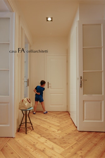 Questo intervento prevedeva la trasformazione degli accessi e delle parti comuni di un edifico del 1915 già oggetto di pesanti interventi di ristrutturazione per nulla rispettosi della specificità dell’architettura dell’immobile. Il programma prevedeva l’abbattimento delle barriere architettoniche e l’inserimento di un ascensore. L’approccio del progetto è stato quello di operare per contrasti, eliminando quanto di posticcio e non originale, restaurando e valorizzando gli originali partiti architettonici e decorativi, recuperando le gamme cromatiche dell’epoca, integrando le porzioni di pavimento andate perse - reinterpretandole - e inserendo le nuove parti tecnologiche caratterizzandole con materiali contemporanei quali l’acciaio e il vetro.