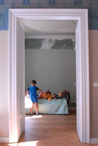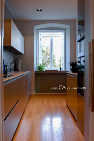 Intervento di trasformazione e restauro di un alloggio di 120 mq in un palazzo del primissimo ‘900 triestino. Il programma prevedeva spazi per una famiglia di 4 persone. Abbiamo scelto di conservare e valorizzare gli affreschi in stile secessione alle pareti e i decori dei soffitti. E’stato conservato il pavimento della cucina in lastre di calcare grigio.