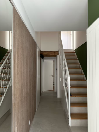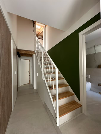 Nell’estate 2024 abbiamo ristrutturato un alloggio abbandonato di circa 60 mq ampliandolo con il recupero di un sottotetto fatiscente. Il programma prevedeva di dover alloggiare una giovane coppia e la loro bimba con un budget il più limitato possibile. I necessari interventi di rinforzo alle strutture lignee della copertura e dei solai sono stati eseguiti in carpenteria metallica, così come la scala, pensata e costruita ad hoc per essere il vero elemento di pregio di questo intervento. La scelta oculata dei materiali e degli arredi, entrambi tratti dalla produzione di massa, e la loro modifica con opere di falegnameria su misura, rendono questo intervento un progetto di recupero giovane e fresco che è stato concluso centrando gli obiettivi prefissati.