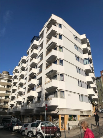 Siamo intervenuti su circa 1.800 mq di superfici di facciata e le strutture di 54 balconi, con necessità di risolvere le variegate problematiche che affliggevano l’edificio (recuperare i calcestruzzi danneggiati, correggere i ponti termici, bonificare l’Eternit). Nel contempo tutte le soluzioni di dettaglio sono state ripensate al fine di ripulire l’edificio - privo di particolare pregio compositivo - da orpelli e formalismi e consolidarlo in una nuova sobrietà architettonica.