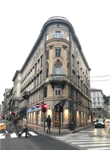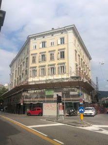 Un edificio di grandi dimensioni che definisce uno degli isolati cerniera del Borgo Teresiano. Più volte manomesso nel corso del tempo, sin dalla sua costruzione ha subito le modifiche necessarie a meglio inserirsi nel tessuto urbano man mano che lo stesso andava modificandosi con la costruzione della Via Carducci. Alla fine dell’800 l’edificio ha raggiunto la sua conformazione attuale con la costruzione – a integrazione della fabbrica originaria – della caratteristica soluzione ad angolo stondato alla quale è stato abbinato un partito architettonico particolarmente ricco e composito per valorizzare le altre facciate, sostanzialmente neutre. Abbiamo concluso questo intervento di restauro monumentale nel 2021.