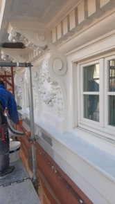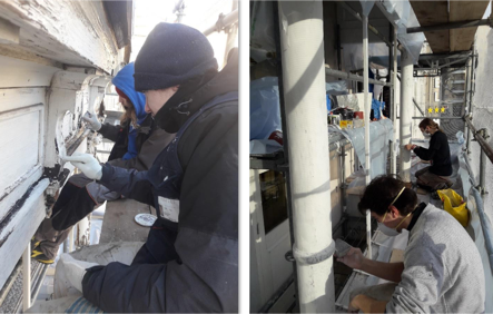 Il progetto di restauro conservativo ha dunque avuto come presupposto lo studio filologico degli elementi costitutivi della facciata, dei suoi materiali e dei cromatismi originali, proponendosi il recupero dell’assetto originario attraverso l’utilizzo di tecniche e materiali dell’epoca.