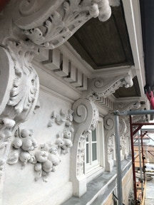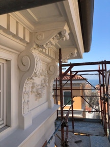 Abbiamo studiato un progetto di restauro della facciata, del loggiato e dalla grande scalinata, oltre che delle parti lapidee e scultoree, con il recupero filologico dell’apparato decorativo.