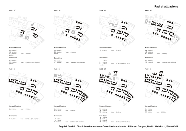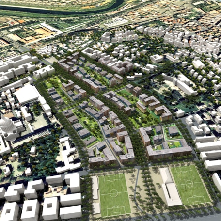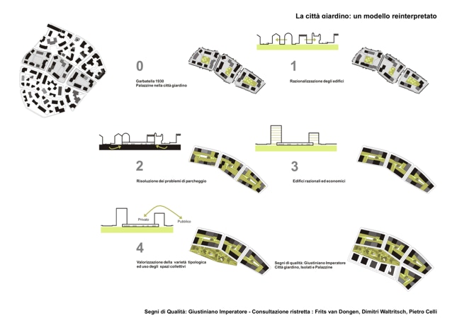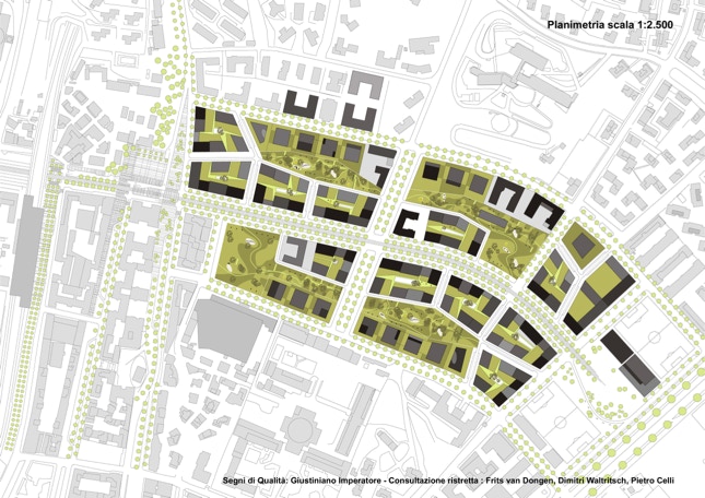 Abbiamo realizzato questo progetto nell’ambito di una consultazione ristretta necessaria a riqualificare urbanisticamente il quartiere Giustiniano imperatore a Roma. La municipalità, dovendo affrontare una pesante problematica di dissesto idrogeologico, ha proposto la progressiva sostituzione degli edifici esistenti (circa 2.300 appartamenti) oltre a 25.000 mq di spazi commerciali. Realizzato in una partnership guidata da F. Van Dongen il masterplan ha ridisegnato questa parte di città reinterpretando il vicino quartiere della Garbatella edificato negli anni 20 ed in particolare la relazione che lo caratterizza tra spazi pubblici e spazi privati. Il nuovo quartiere introduce così una nuova complessità tipologica organizzandosi attorno ad un parco centrale verso il quale si affacciano gli edifici di altezza più contenuta (quattro livelli) oltre che corpi di fabbrica isolati che reinterpretano la tipologia della “Palazzina” romana. Lungo i viali, i nuovi blocchi affrontano il tema della grande scala alzandosi fino a 8 livelli.