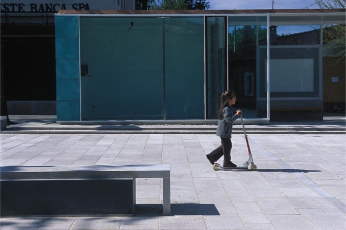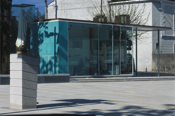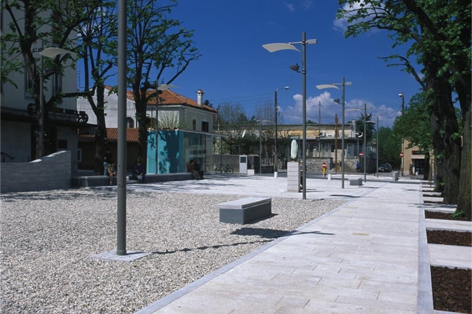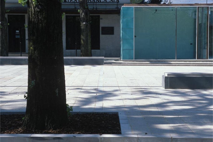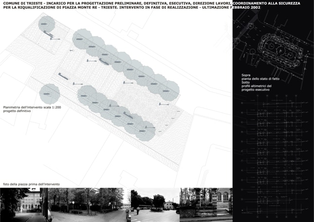 Questa realizzazione è frutto di un concorso che abbiamo vinto nel 1999 per riqualificare Piazzale Monte Re, luogo centrale del Borgo carsico di Opicina, che versava in una evidente condizione di marginalità e degrado.